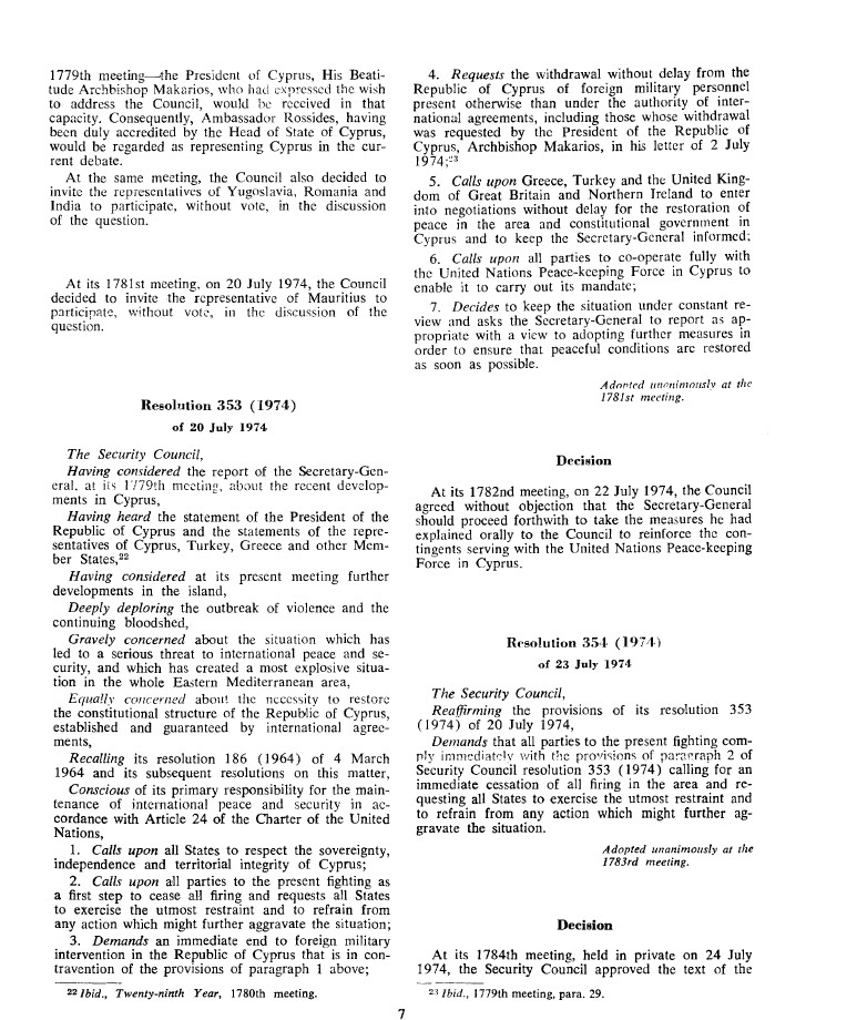 | Yayın Adı | Resolution 354 (1974) / [adopted by the Security Council at its 1783rd meeting], of 23 July 1974: Security Council resolution 354 (1974) [on a cease-fire in Cyprus] |