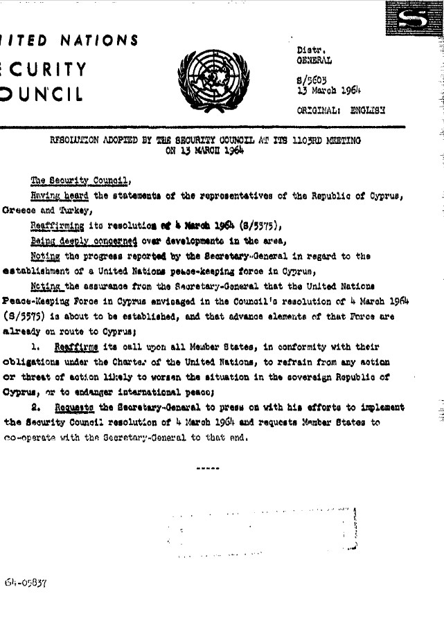 | Yayın Adı | Resolution adopted by the Security Council at its 1103rd meeting on 13 March 1964 [on implementation of resolution 186 (1964) on the Cyprus question] |
