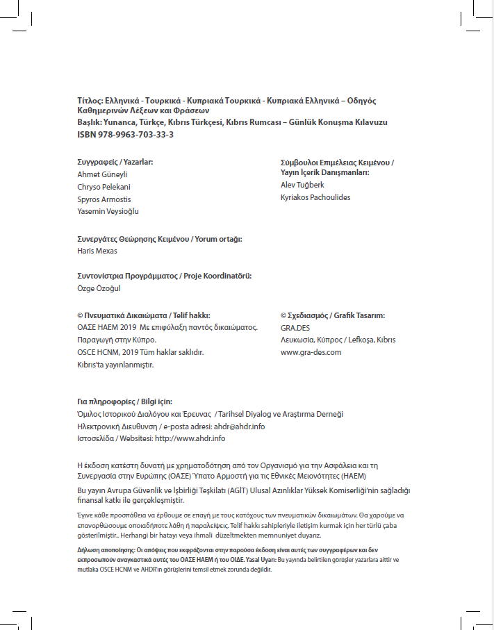 Bu elkitabı, Standart Yunanca, Kıbrıs Rumcası, Standart Türkçe ve Kıbrıs Türkçesi ağızlarında yaygın olarak kullanılan onüç konu başlığını temel alarak hazırlanmıştır. Ayrıca, her harfin nasıl seslendirileceğini ayrıntılı olarak gösteren bir Okuma Kılavuzu da kitapçığa eklenmiştir.